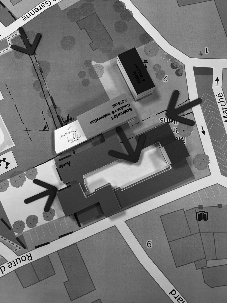 Les discussions ont également mis en avant la nécessité de créer un véritable «carrefour fonctionnel » entre les différents équipements : école, périscolaire,restauration et espaces publics. L’idée d’un préau traversant reliant ces différentes fonctions, tout en protégeant les cheminements piétons, a ainsi émergé comme un principe structurant du futur aménagement.