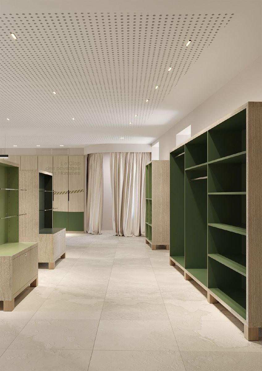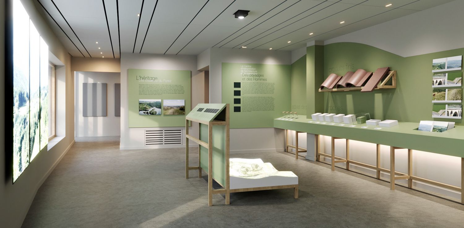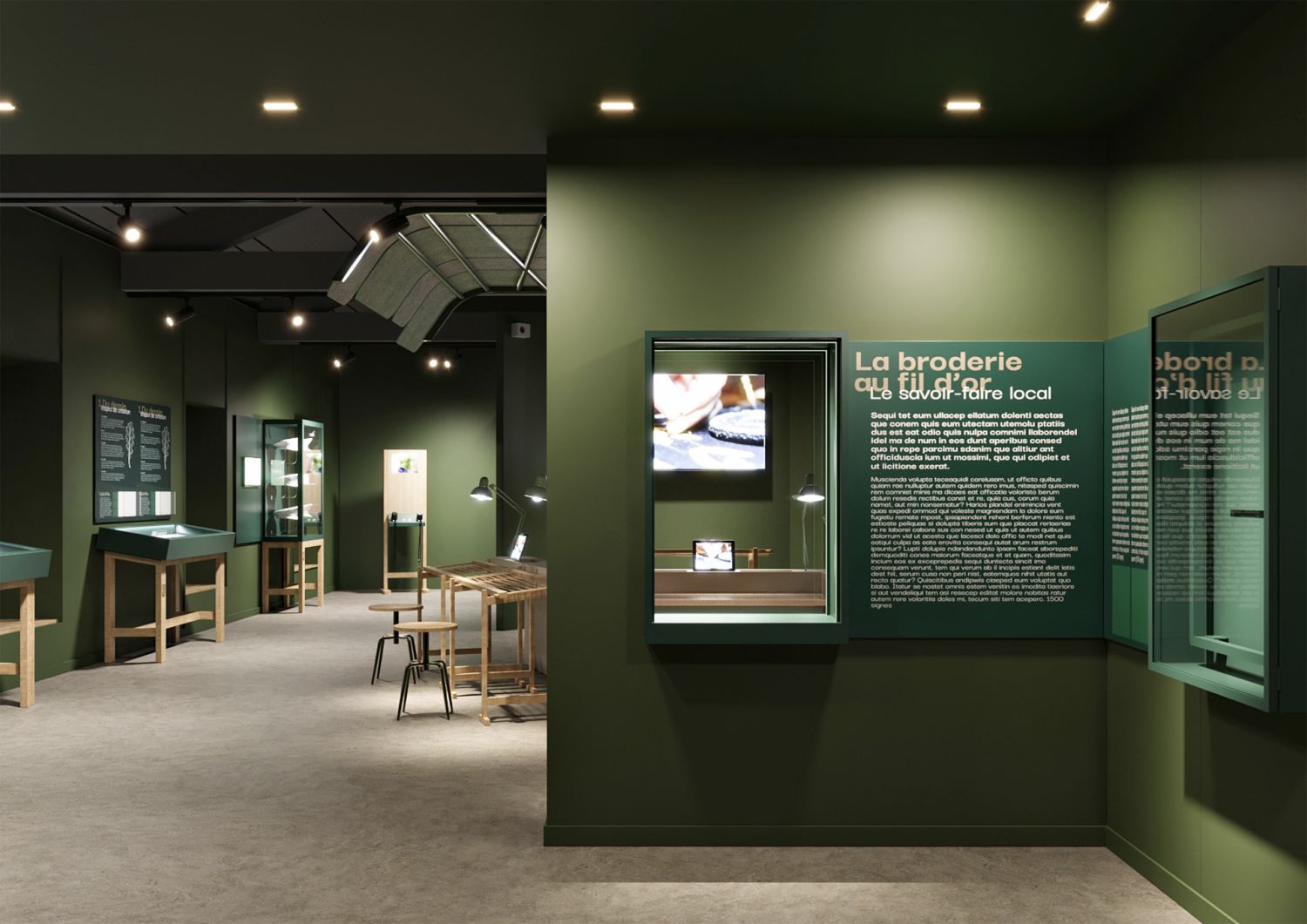 L’esthétique du projet repose sur des matériaux bruts et naturels, associés à une palette de verts sourds. Ce choix établit un dialogue entre les deux niveaux d’exposition : au musée, il évoque l’univers militaire des broderies d’apparat. au CIAP, il fait écho aux paysages du Forez. Cette