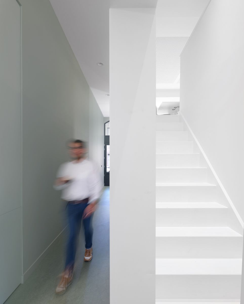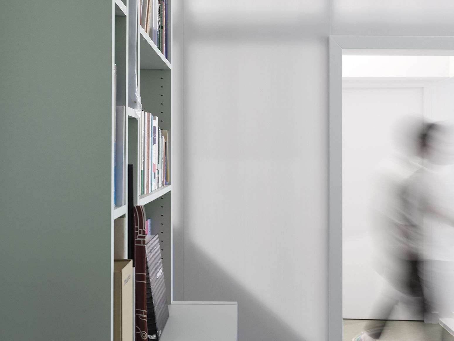 Au cœur de l’espace, une micro-architecture blanche, conçue comme un cube central en polycarbonate translucide,structure l’organisation des lieux. Ce volume, à la fois discret et emblématique, regroupe les fonctions essentielles de l’agence : salle de réunion, atelier, reprographie, cuisine, espace de visio, sanitaires et rangements. Sa matérialité translucide permet de laisser entrevoir les usages qu’il abrite, notamment en soirée, lorsque la lumière intérieure révèle les silhouettes et les activités, créant une atmosphère vivante et poétique.