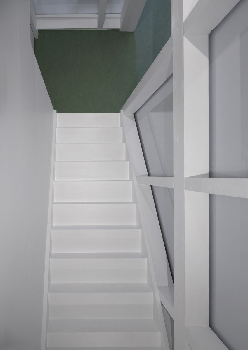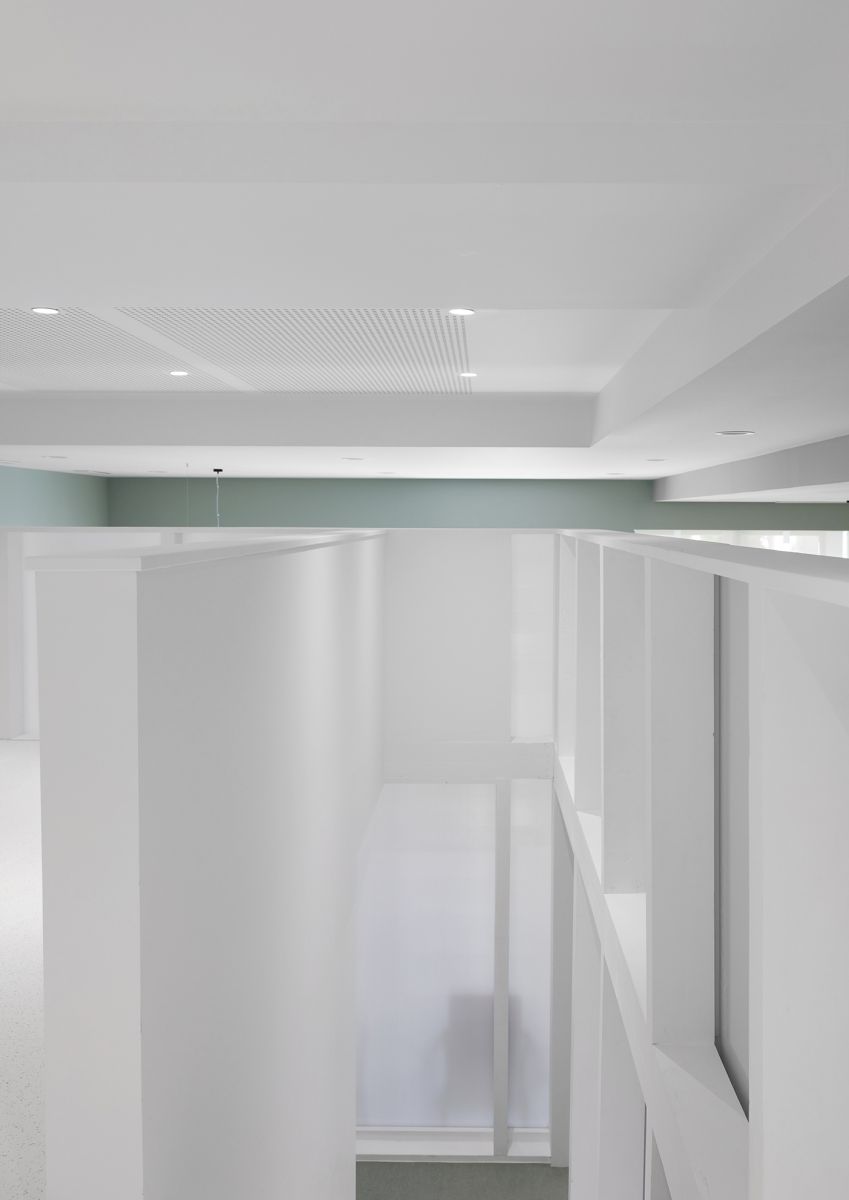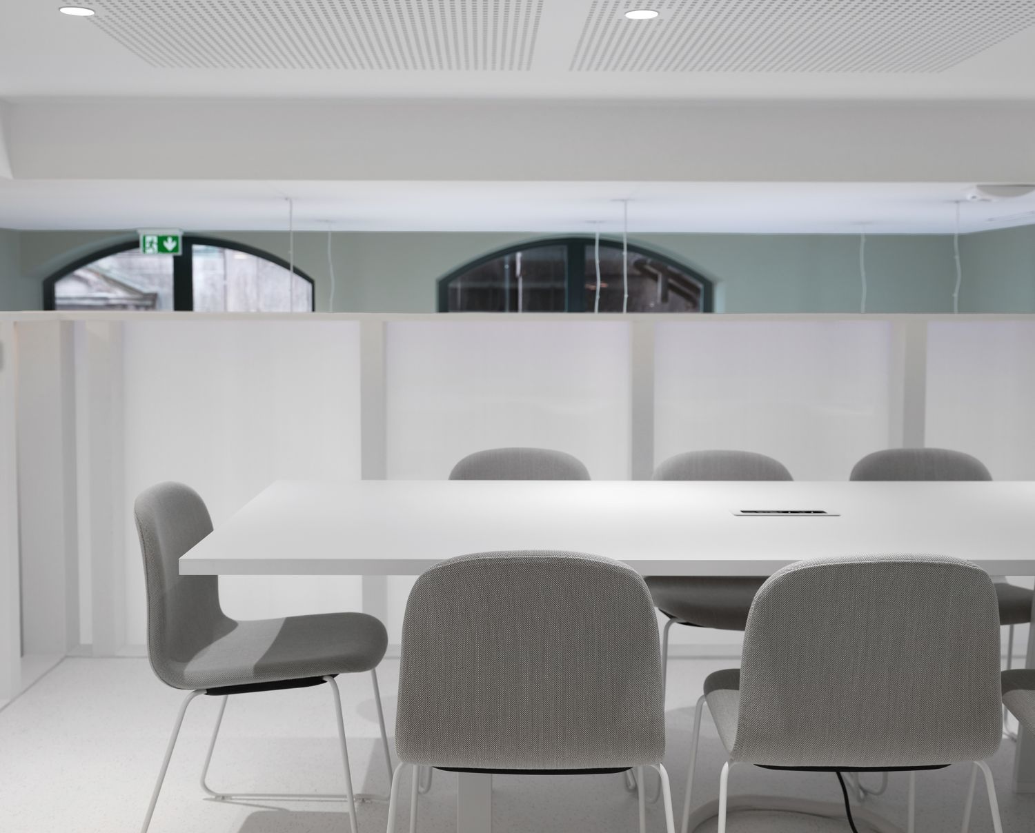Ce cube agit comme un repère spatial, une sorte de cœur fonctionnel autour duquel gravitent les espaces de travail et de création. Sa blancheur et sa géométrie simple contrastent avec les textures naturelles du bois et les tonalités douces qui habillent le reste des bureaux. Il incarne une forme de rigueur et de clarté, tout en favorisant une lecture fluide et intuitive de l’espace.
