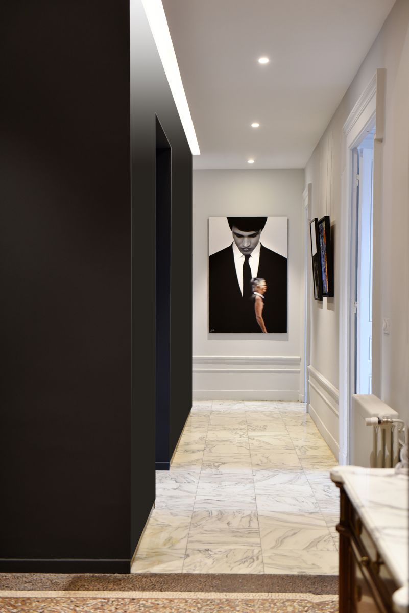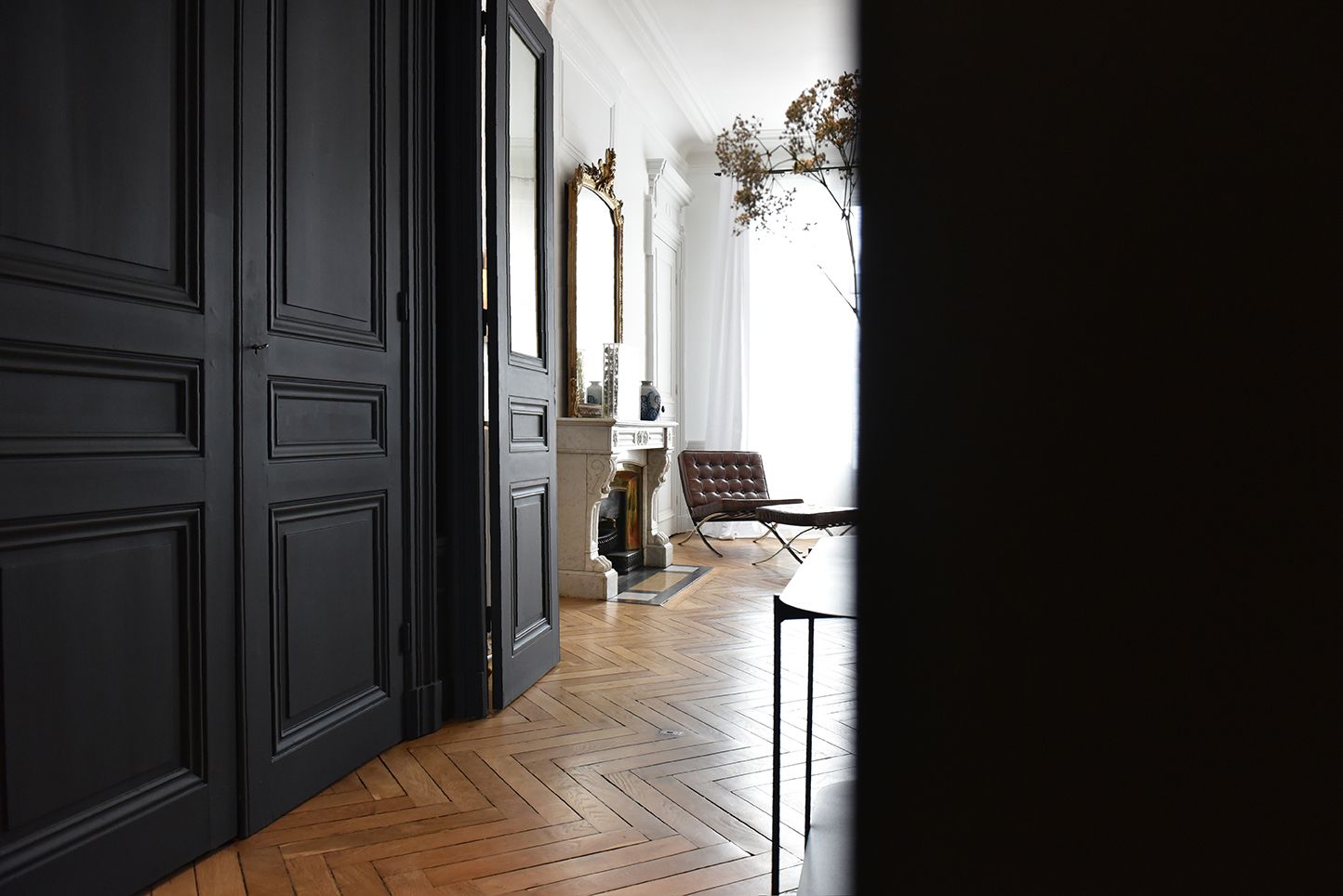 Ce jeu de contrastes entre ombre et lumière, entre profondeur et clarté, permet de révéler avec subtilité les moulures, les volumes et les matériaux d’origine, tout en affirmant une identité résolument contemporaine.