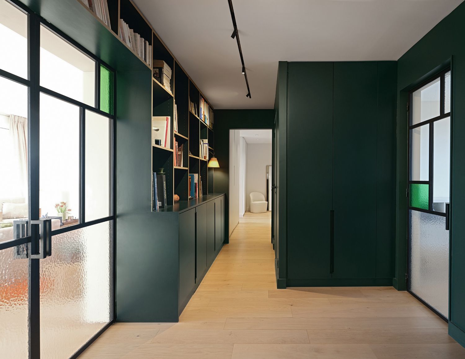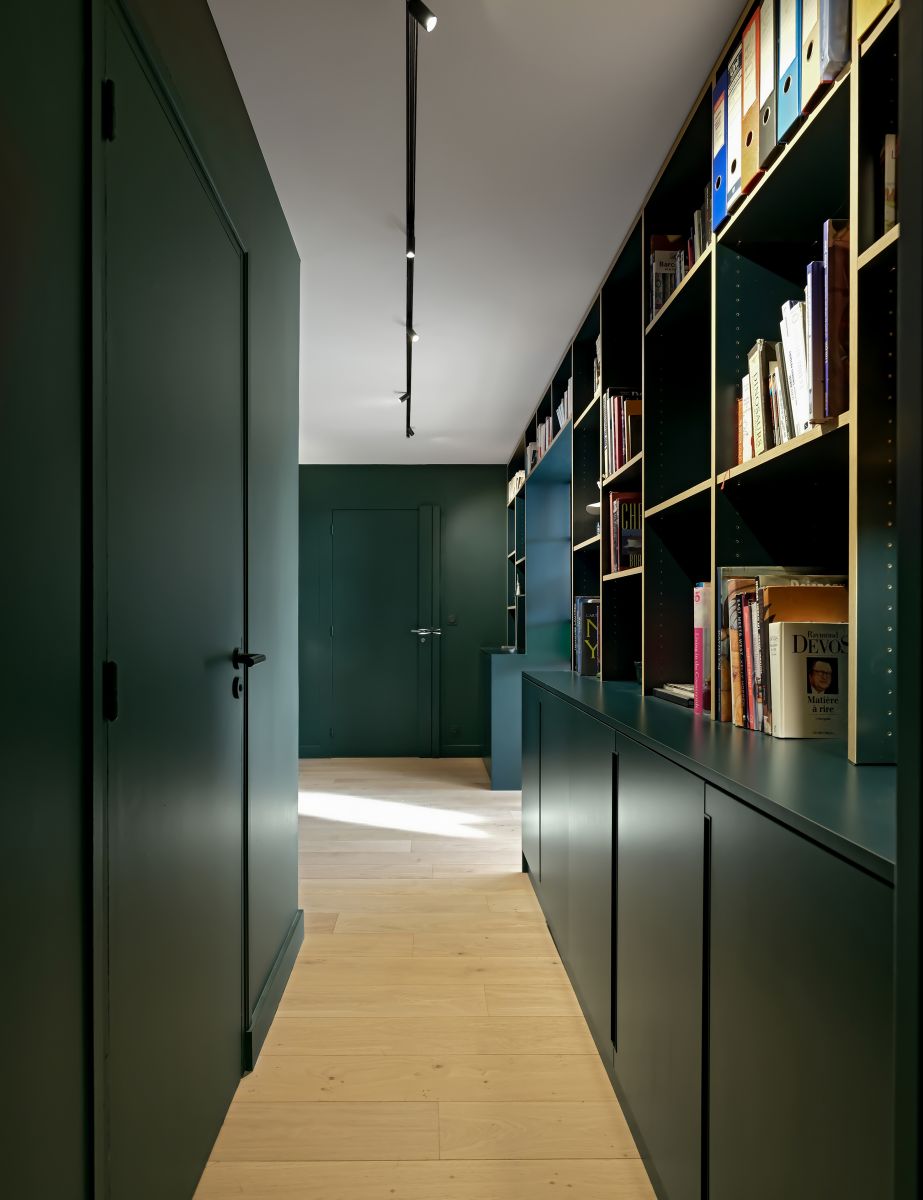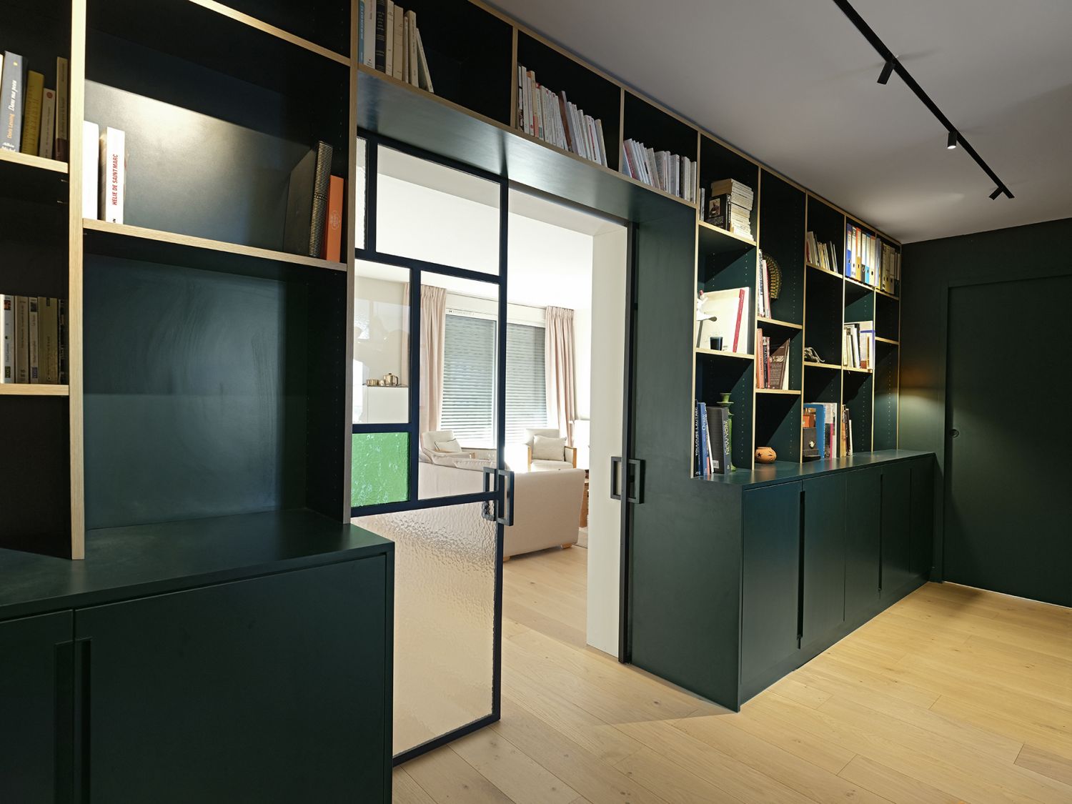 Le projet s’organise autour d’un hall d’entrée central, véritable pivot de l’appartement, qui dessert l’ensemble des pièces. Ce hall a été conçu comme un espace de transition fluide, intégrant les fonctions nécessaires à l’accueil des visiteurs — sanitaires, rangements, vestiaire —tout en préservant l’intimité des espaces privatifs. Cette organisation permet de distinguer clairement les zones ouvertes à la convivialité et celles réservées à la vie de famille.