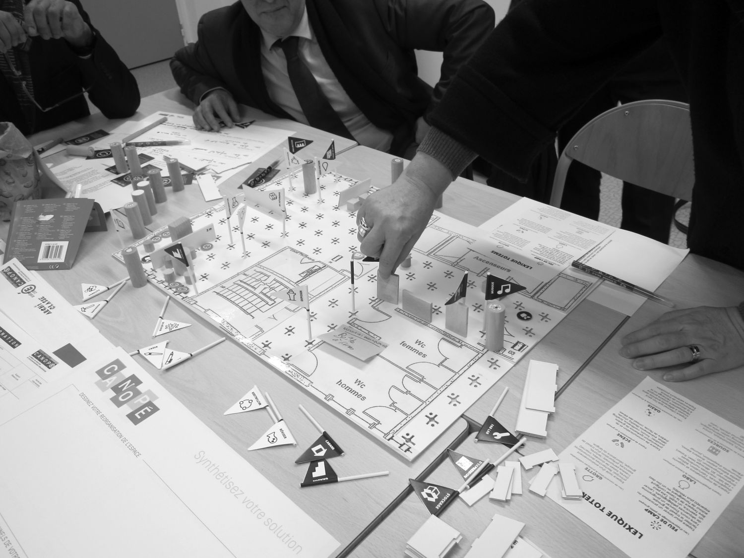 La démarche se déroule en quatre temps de jeu, chacun mobilisant des compétences différentes, pour construire progressivement un projet partagé. Ce processus rend les besoins tangibles et facilite le dialogue avec la maîtrise d’ouvrage dans le cadre d’un projet de rénovation ou de construction.