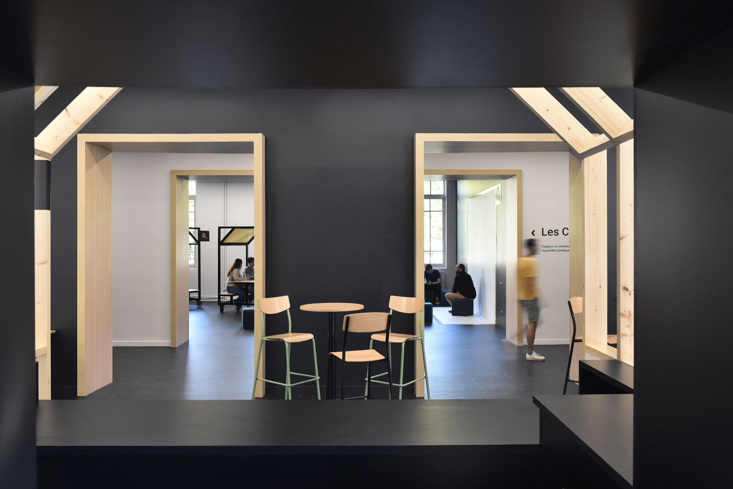 L’identité du lieu s’exprime à travers une matière noire omniprésente, travaillée dans ses multiples états : brute, lisse, rainurée,brillante, perforée, etc. Une référence directe au charbon, à la mine, mais aussi à la haute technicité, à l’image d’une « boîte noire » contenant savoirs, brevets et innovations.