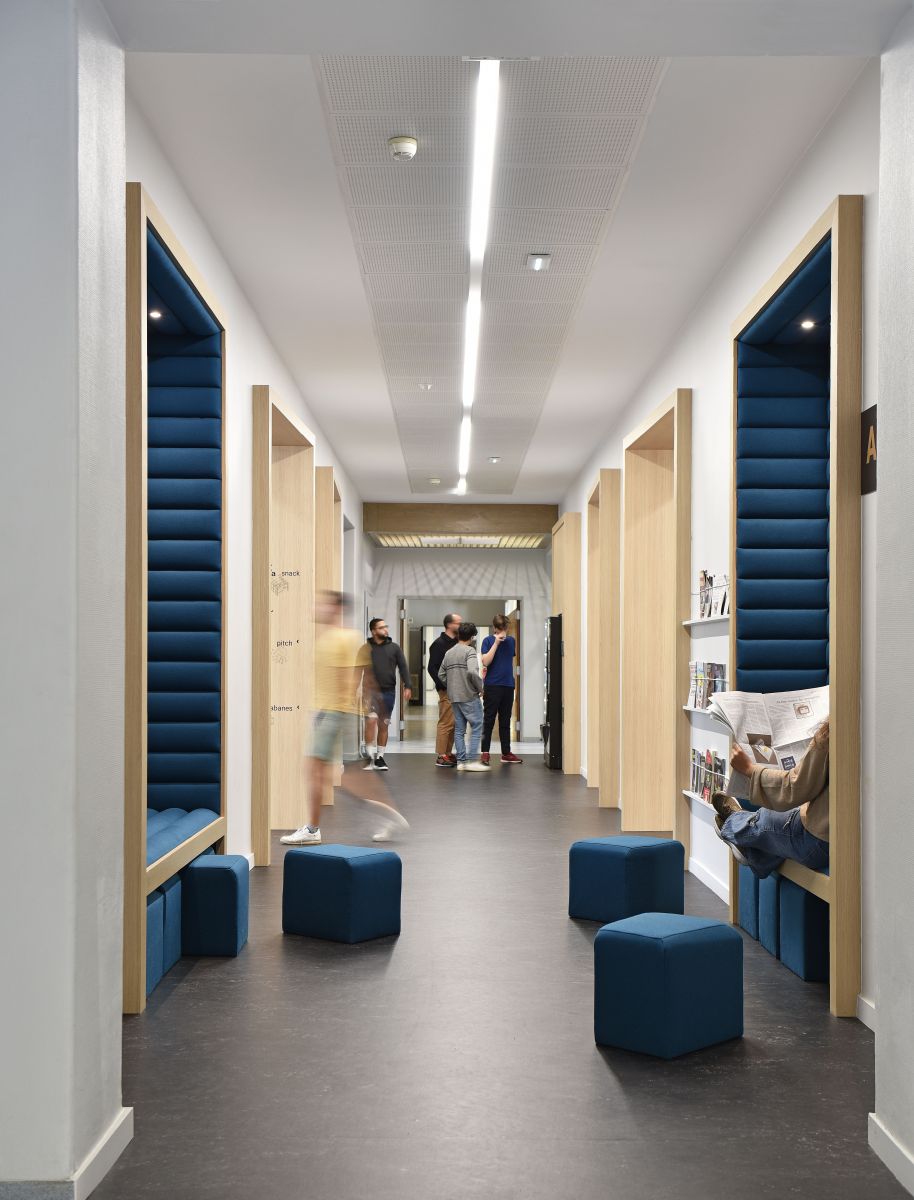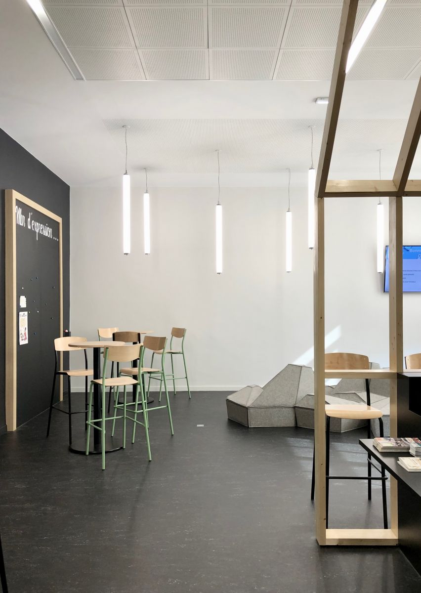Le constat était clair : une faible fréquentation de ces espaces et une absence de vie étudiante au cœur même de l’établissement. L’objectif de la mission était donc de requestionner ces lieux pour leur redonner un rôle central dans la dynamique de l’école, en proposant un aménagement modulable, flexible et fédérateur, capable de raviver la vie collective et de renforcer le sentiment d’appartenance.