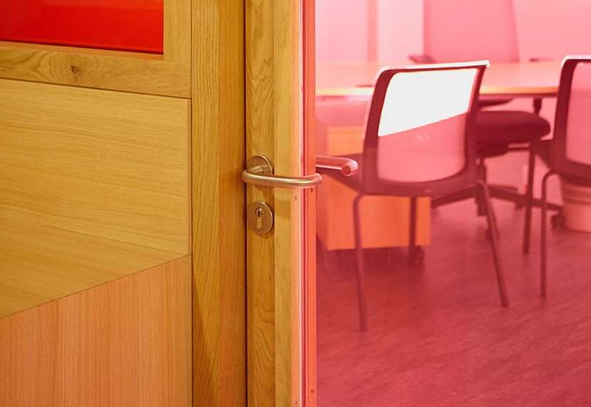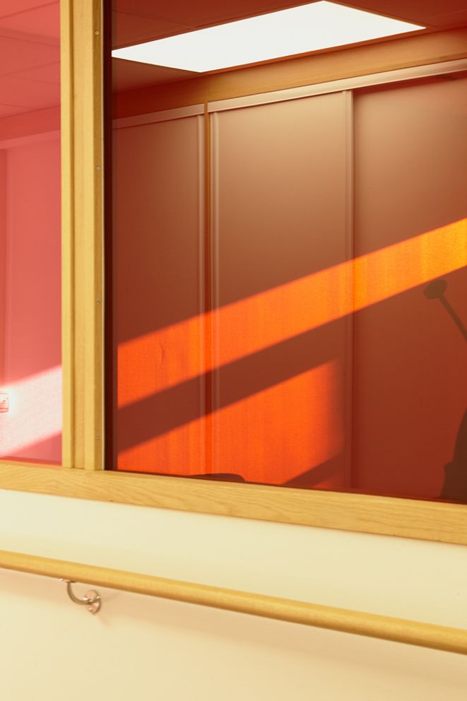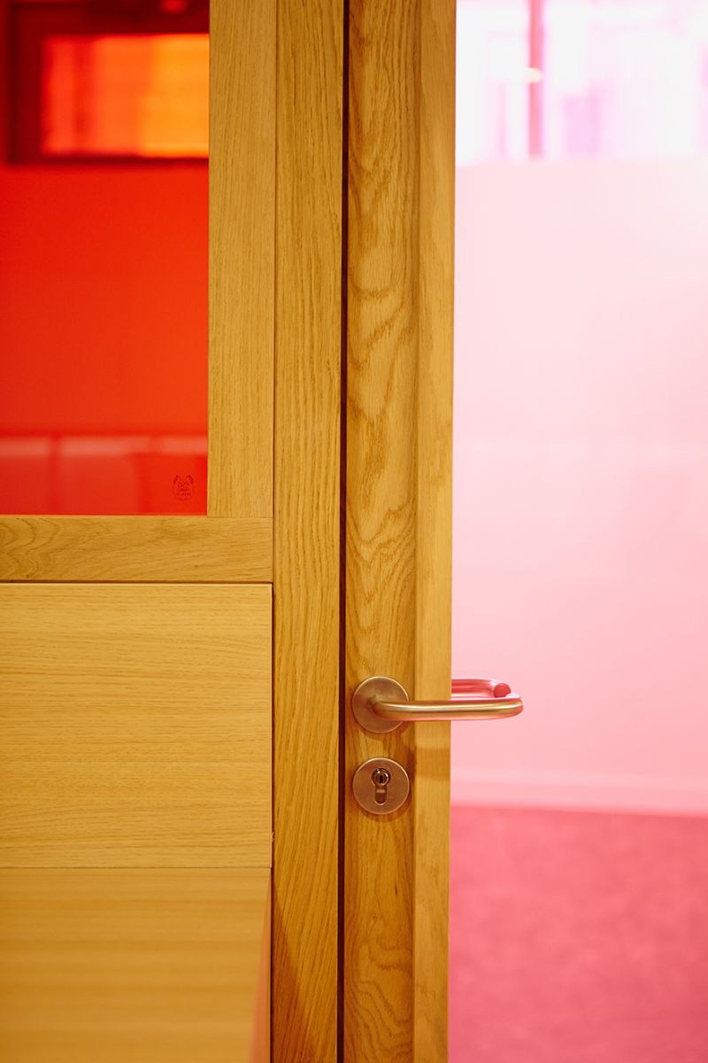 Les cloisons vitrées, ponctuées de filtres colorés inspirés de la charte graphique de l’ERA, introduisent une dynamique visuelle tout en jouant avec la lumière naturelle. Les camaïeux de rouges apportent rythme et identité, tout en renforçant la cohérence graphique de l’ensemble.