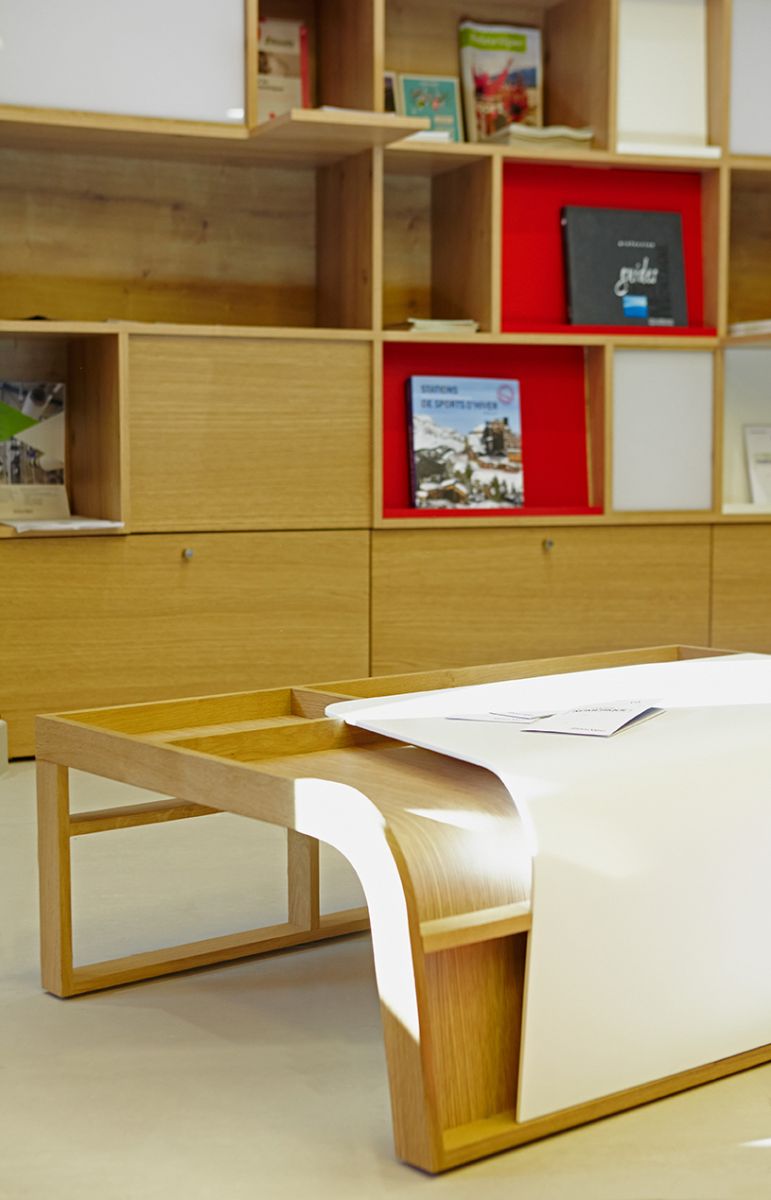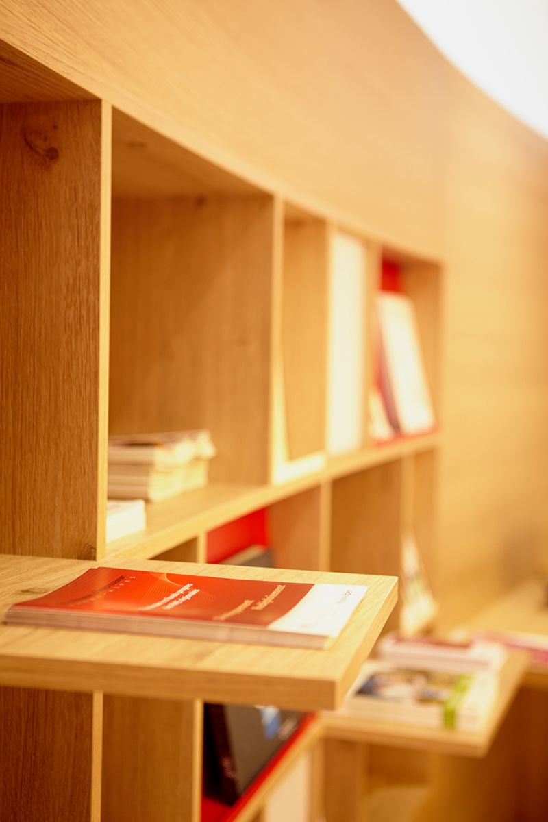 Le bois, utilisé comme matériau principal, incarne une volonté de sobriété et de chaleur. Il confère aux espaces une ambiance douce et accueillante, tout en s’inscrivant dans une esthétique contemporaine. Ce choix renforce le confort visuel et acoustique, et participe à la création d’un cadre de travail apaisant.