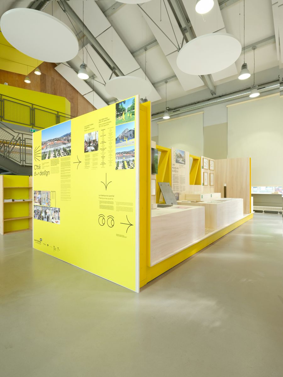 En accord avec l’identité géographique du District Créatif, la scénographie s’appuie sur une palette visuelle lumineuse, ponctuée de jaune — couleur identifier développée par Saguez& Partners pour créer du lien dans l’espace urbain.