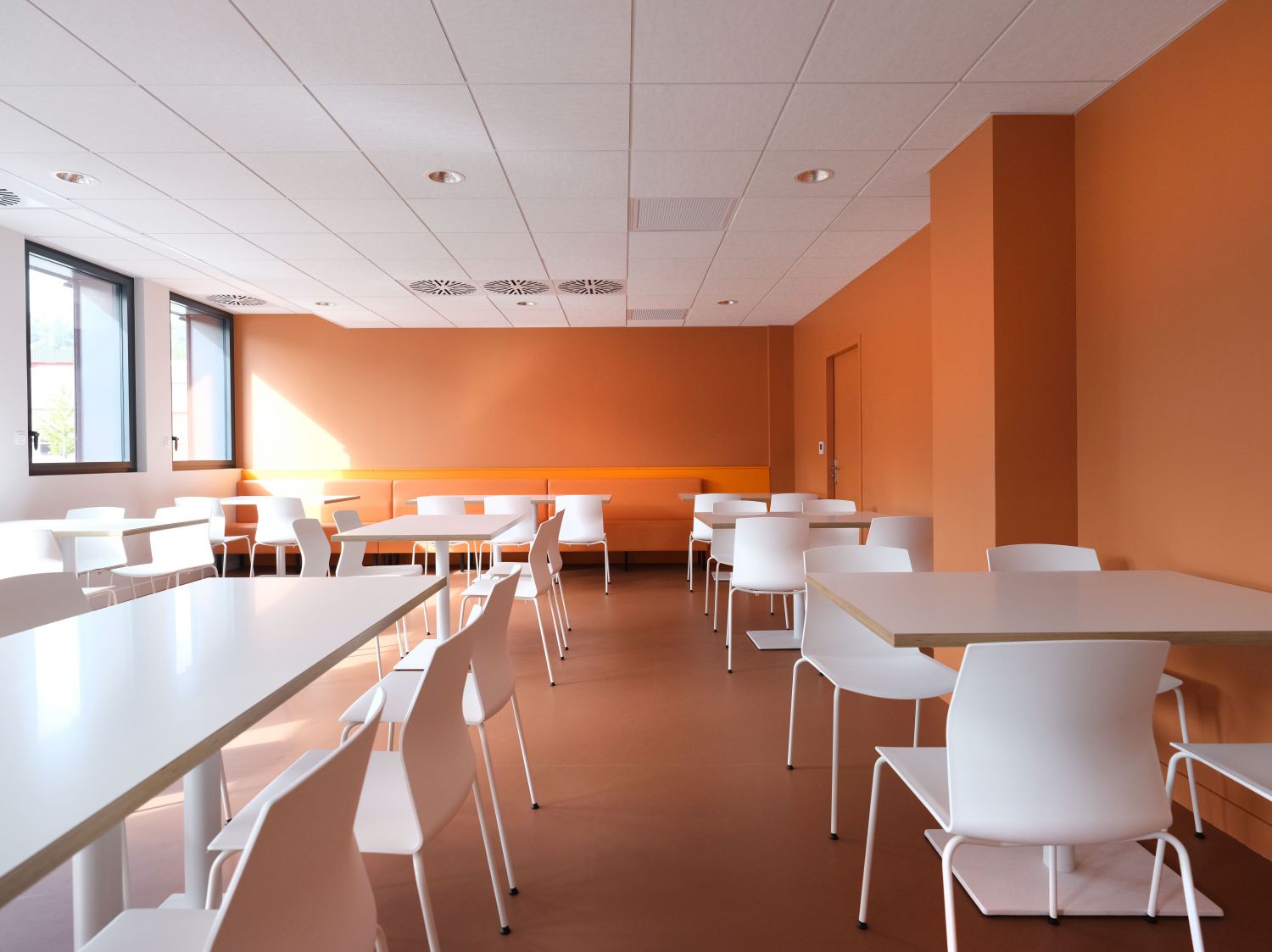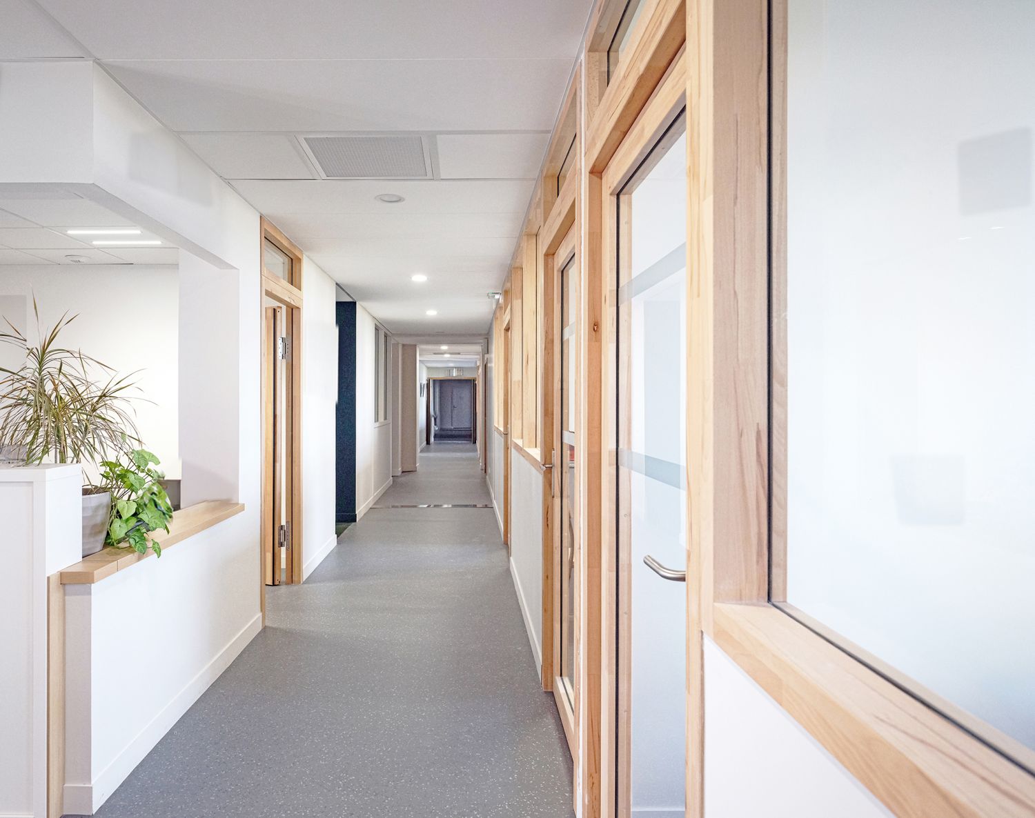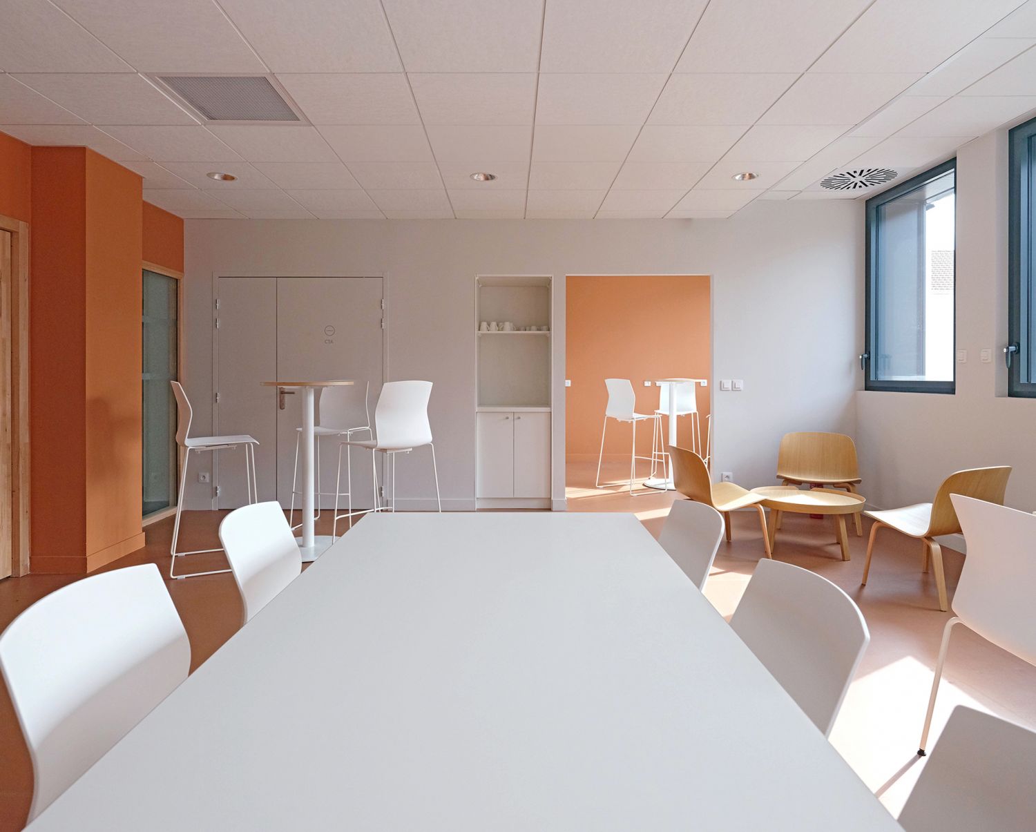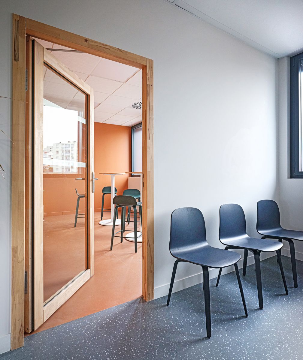 Le choix des matériaux et des couleurs reflète, quant à lui, une volonté de sobriété dans les espaces communs laissant les entités s’exprimer pleinement :bois naturel, surfaces minérales composent une ambiance épurée, chaleureuse et robuste. Chaque détail a été pensé pour incarner les valeurs de solidarité, de technicité et d’innovation propres au secteur.