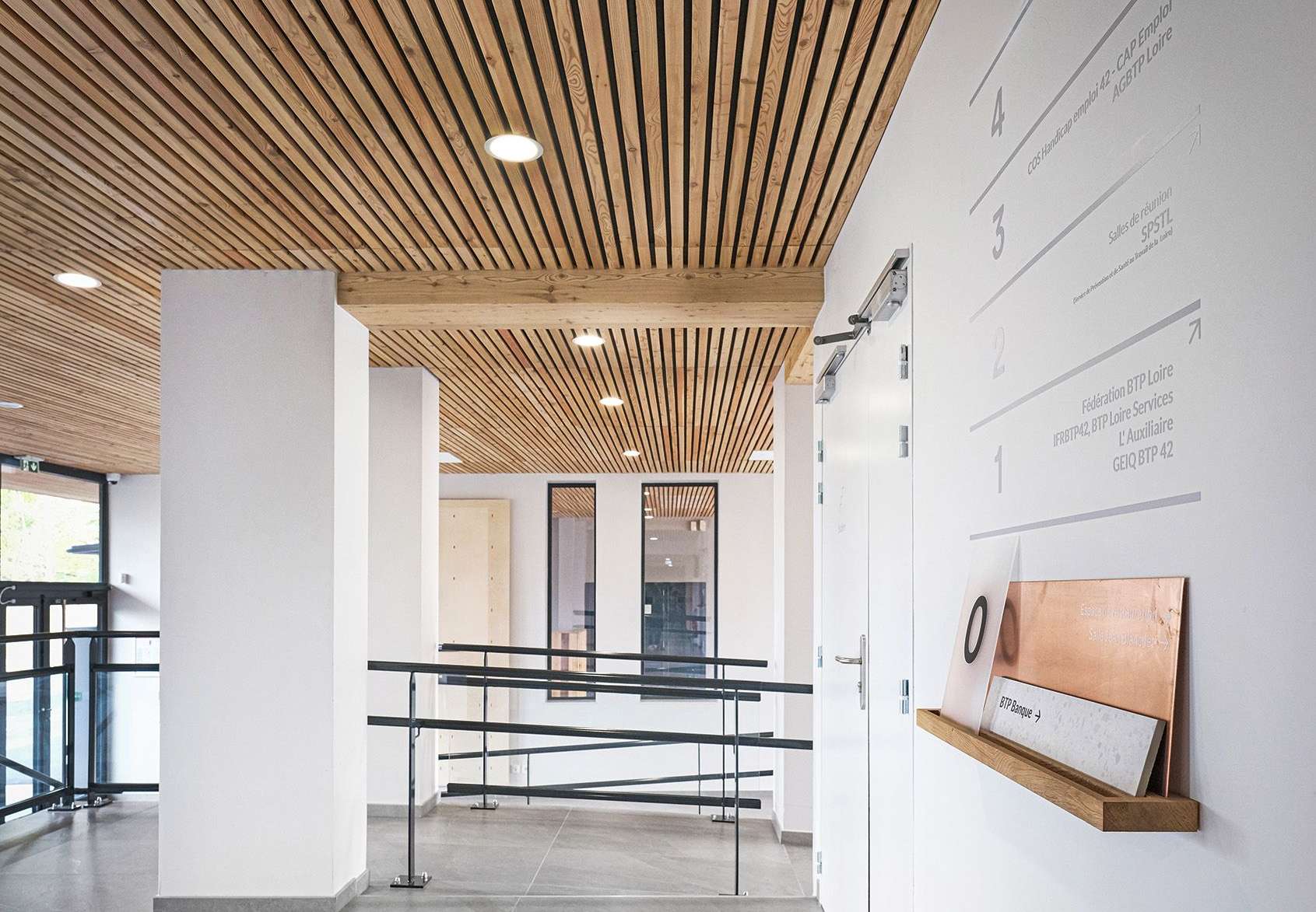 Le rez-de-chaussée de la Maison du BTP a été conçu comme un espace d’accueil vivant et polyvalent, véritable vitrine des savoir-faire des différentes entités présentes sur le site. Plus qu’un simple lieu de passage,il joue le rôle de showroom, mettant en scène les compétences, les projets et les expertises du secteur à travers une scénographie sobre et évolutive. Ce lieu d’exposition et de rencontre favorise la visibilité des métiers du BTP tout en créant un environnement propice à la découverte et à l’échange.